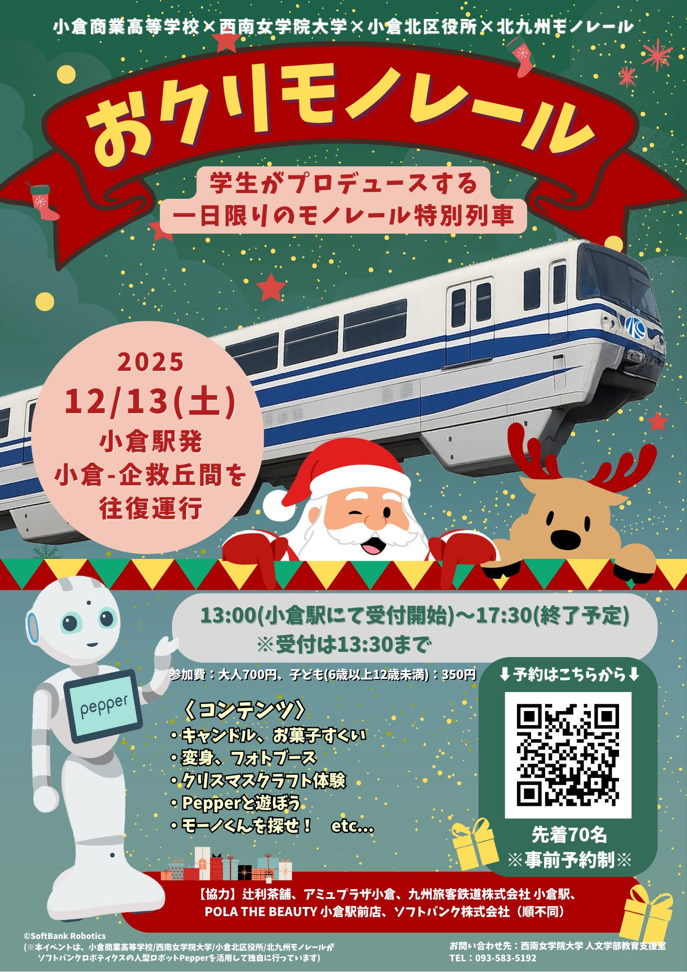 観光文化学科高橋ゼミは、福岡県立小倉商業高等学校と北九州高速鉄道株式会社、小倉北区役所の協力を得て、12月13日(土)にモノレール小倉駅と企救丘駅にて「つなぐヒカリプロジェクト」イベントを実施いたします。