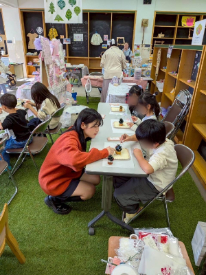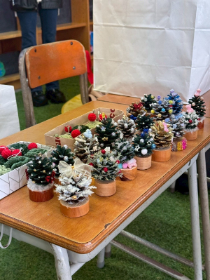また、イベント当日は、松ぼっくりツリーやリース作りのワークショップを行い、小さなお子様から大人の方まで幅広い世代の方に楽しんでいただきました。ワークショップは、松ぼっくりを集めるところから色塗りなどの準備も学生が行い、子ども達が楽しんで参加できるよう工夫を凝らしました。他にも、豚汁やみやこ町の竹を使ったかっぽ酒、オリジナルマグカップドリンクの販売など、地域の特産品や素材を活かした内容を取り入れることで、みやこ町らしさを感じていただけるイベントとなりました。