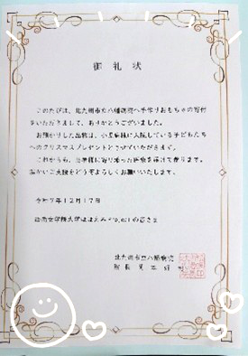 完成したおもちゃを、北九州市立八幡病院へ代表者が寄贈させていただきました。