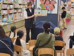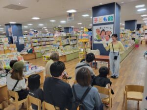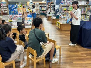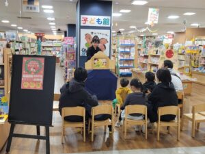 また、年に4回ほど、書店内でおはなし会を開催しています。参加した子どもたちは、興味津々で絵本や紙芝居、パネルシアターを見ながら、学生の動きに合わせて時には一緒に手遊びを楽しんでいます。書店では、たまたま書店に来ている親子に声をかけおはなし会に誘っています。初めて出会う、年齢が違う子どもたちが参加するため、目の前の子どもに合わせて行えるように複数のプログラムを準備し、反応を見ながら内容を変えていきます。また、子どものつぶやきを受け止めたり、目と目を合わせて話をしたりなど、参加者と一体となって会を進められるようにしています。終わった後も活動の振り返りをすることで、次への課題を確認します。